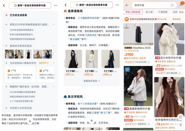 作为对比,下图也展示了“换季衣服”这一关键词在常规搜索界面返回的结果。以笔者的需求来看,AI 能够帮助缩小一些选择范围,但面对服饰这种消费决策过程较复杂的品类,多番比对大量浏览的流程通常是“简略”不了的。
